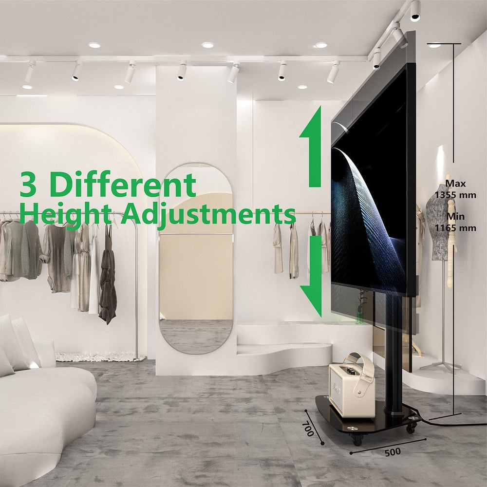 Der XTRARM Proton 100 ermöglicht es, die TV-Höhe individuell anzupassen. Unabhängig vom Sitzplatz oder dem Raumlayout ist die perfekte Blickhöhe einfach einzustellen. Ob beim Fernsehen im Wohnzimmer, im Schlafzimmer oder sogar im Konferenzraum - dieser TV-Ständer passt sich Ihren Bedürfnissen an. Der Ständer ist mit robusten, feststellbaren Rollen ausgestattet, die müheloses Bewegen und Positionieren ermöglichen. Damit wird die Mobilität des XTRARM Proton 100 sowohl flexibel als auch sicher. Der XTRARM Proton 100 bietet eine 90-Grad-Rotation, so dass der Fernseher vom Querformat ins Hochformat rotiert werden kann. Auf der gläsernen Bodenplatte ist ausreichend Platz für zusätzliche Geräte.