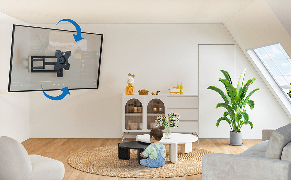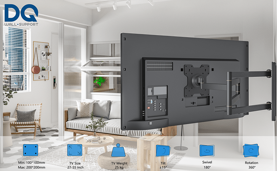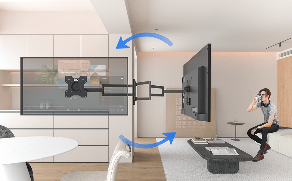 Die DQ Rotate XL 108,5 cm ist eine schwenk-, neig- und drehbare Wandhalterung. Die über 4 Drehpunkte beweglichen Arme geben der Halterung eine hohe Flexibilität. Die DQ Rotate XL 108,5 cm ermöglicht die Ausrichtung Ihres Bildschirms in alle Richtungen - seitwärts - vertikal - Hoch- oder Querformat. Ideal, um zum Beispiel in einer Ecke befestigt zu werden.