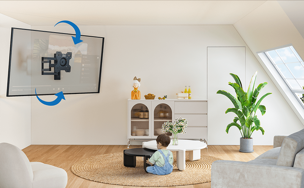 Schwenk-, Neige- und Drehfunktion: Mit vier Drehpunkten ermöglicht die DQ WALL-SUPPORT Rotate XL Wandhalterung eine 360-Grad-Bewegung. Sie können Ihren Bildschirm seitlich schwenken, vertikal neigen und im Hoch- oder Querformat ausrichten.
