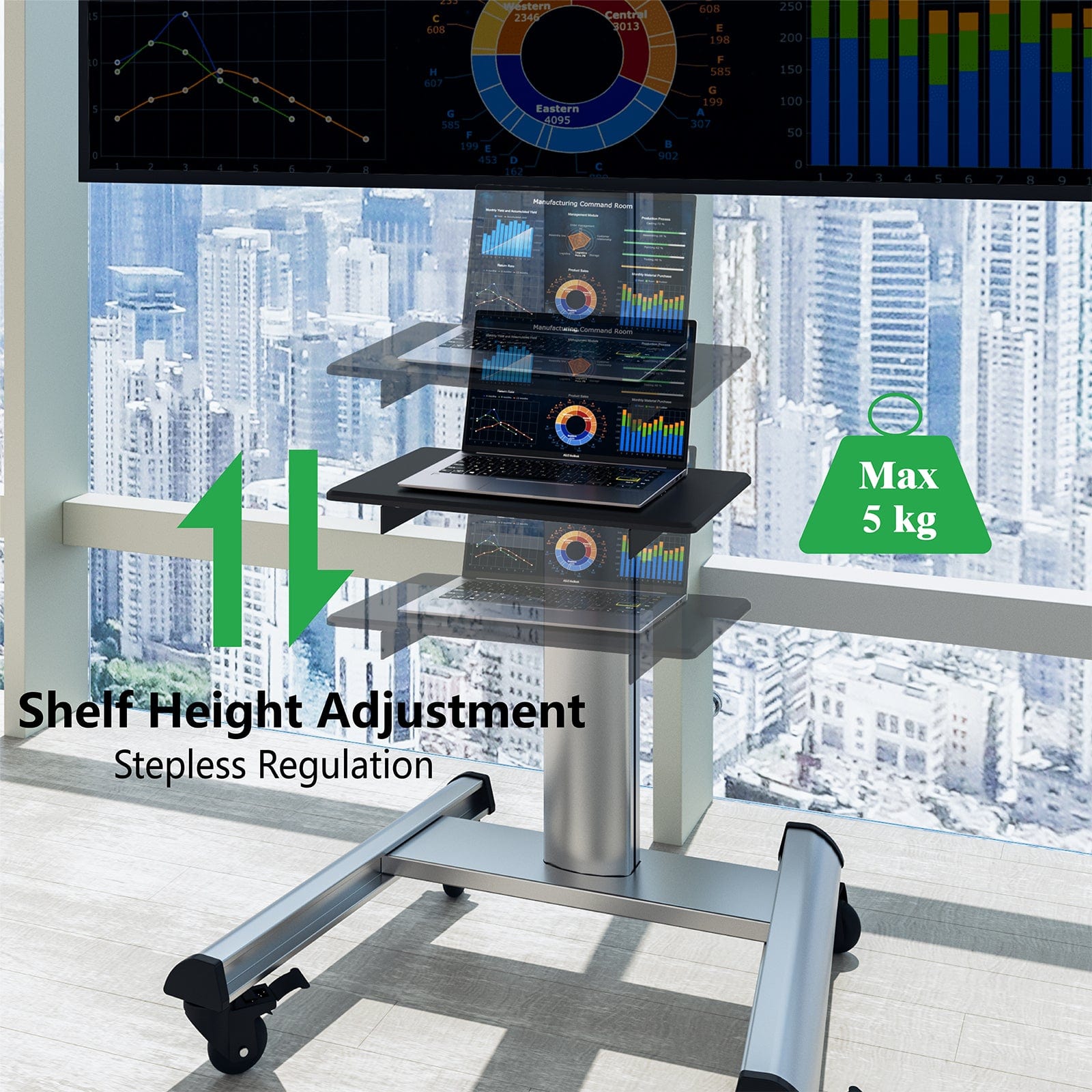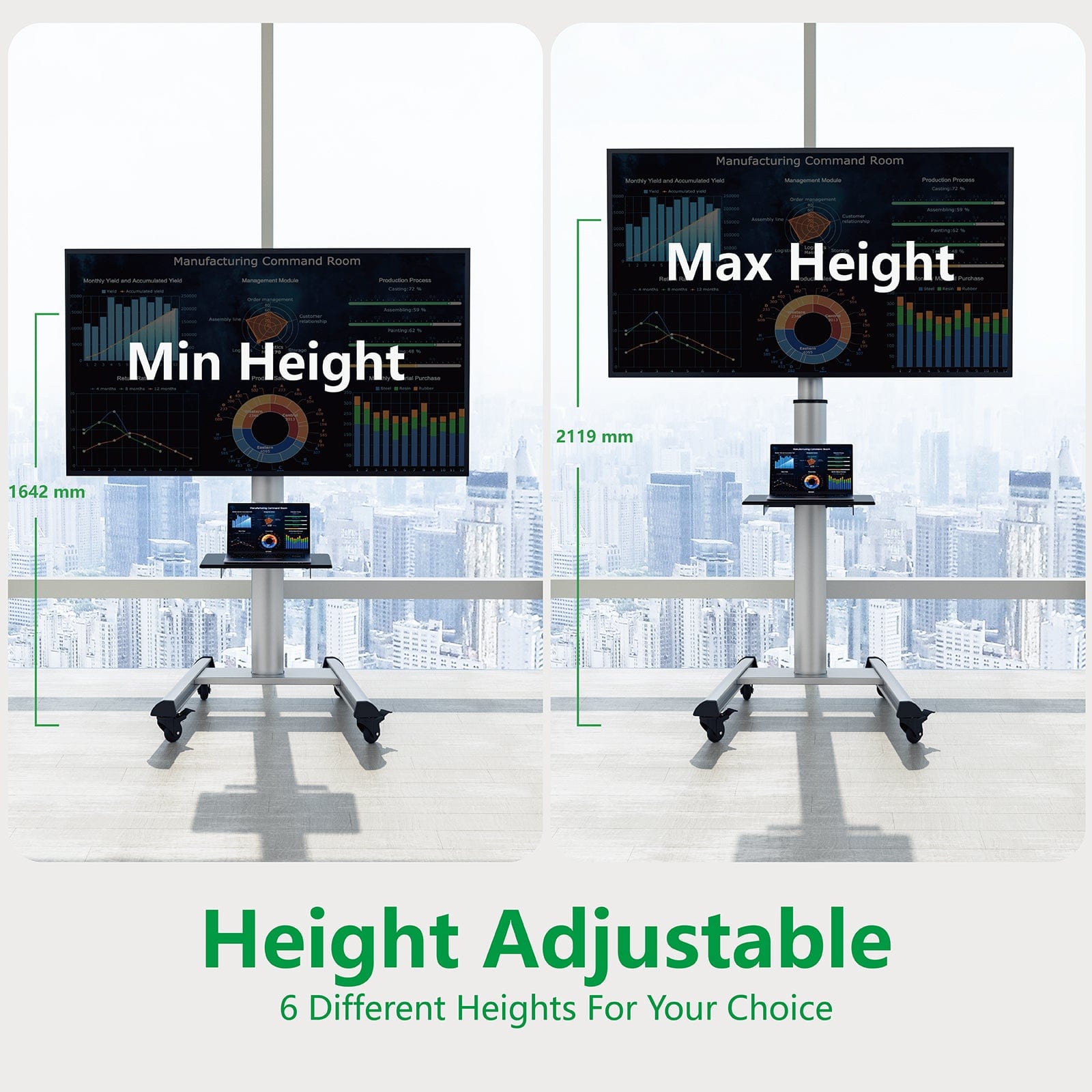 Der XTRARM Proton 500 ermöglicht es, die TV-Höhe individuell anzupassen. Unabhängig vom Sitzplatz oder dem Raumlayout ist die perfekte Blickhöhe einfach einzustellen. Ob beim Fernsehen im Wohnzimmer, im Schlafzimmer oder sogar im Konferenzraum - dieser TV-Ständer passt sich Ihren Bedürfnissen an. Der Ständer ist mit robusten, feststellbaren Rollen ausgestattet, die müheloses Bewegen und Positionieren ermöglichen. Damit wird die Mobilität des XTRARM Proton 500 sowohl flexibel als auch sicher. Der XTRARM Proton 500 bietet eine 90-Grad-Rotation, so dass der Fernseher vom Querformat ins Hochformat rotiert werden kann. Auf der Ablage ist ausreichend Platz für zusätzliche Geräte.