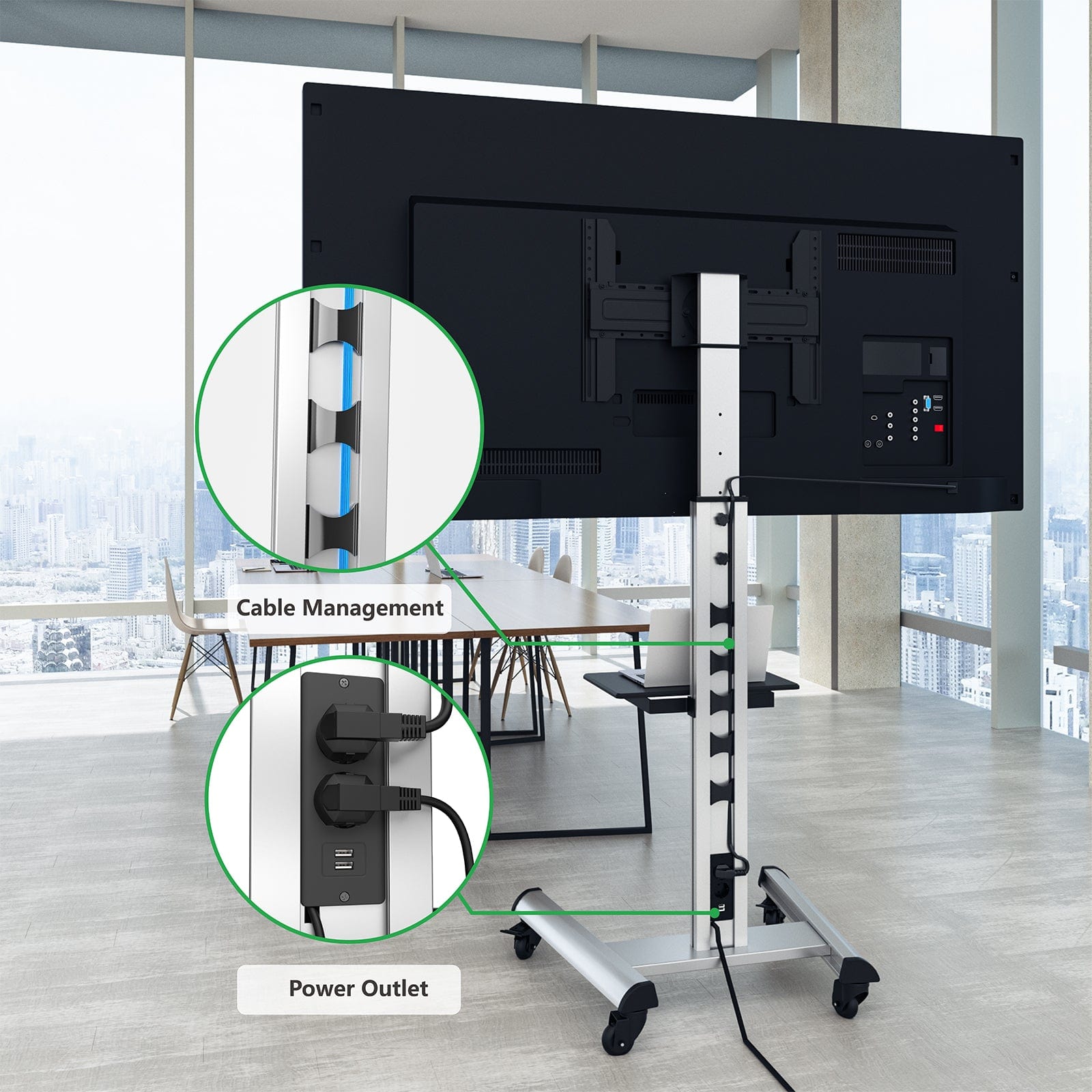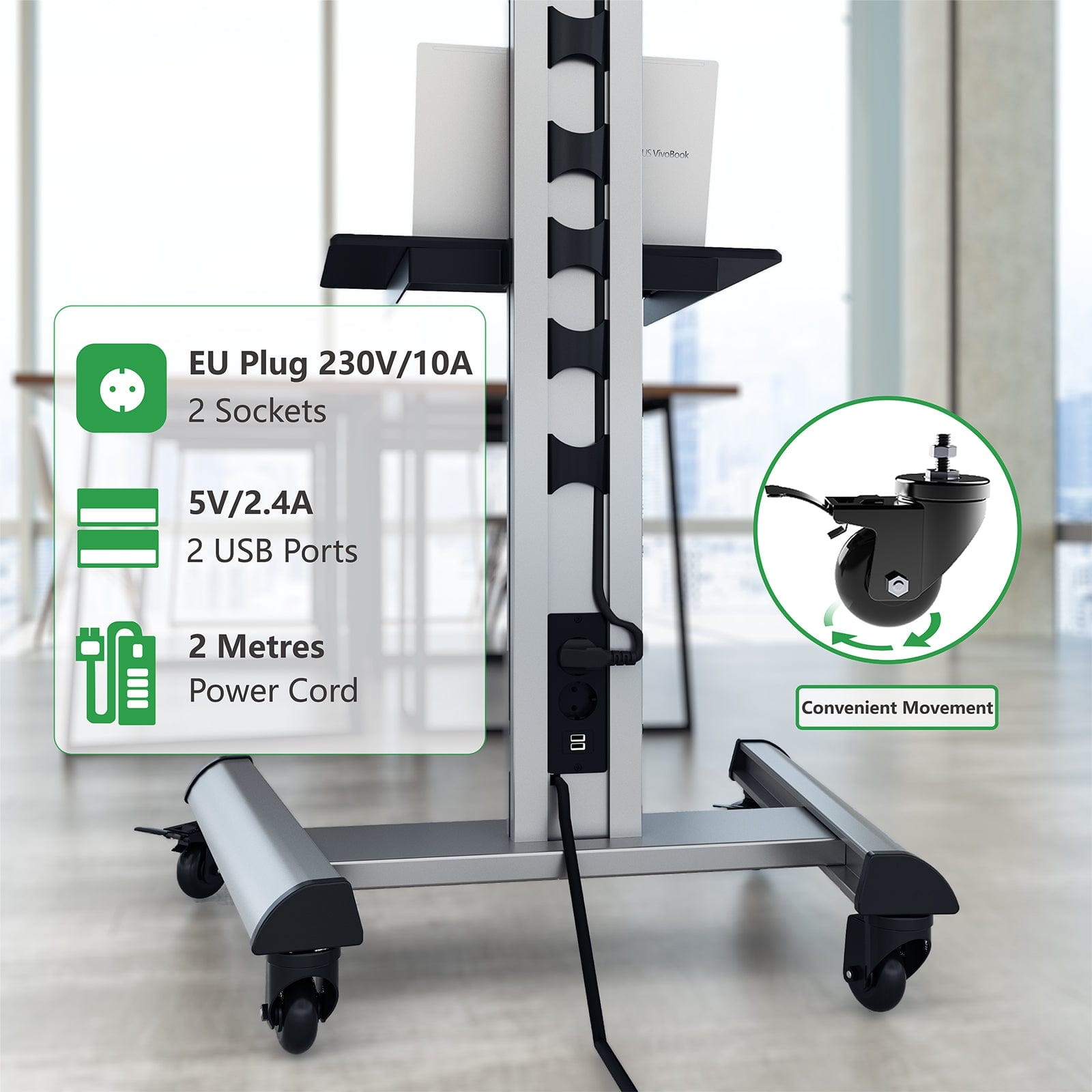 Dank der eingebauten Steckerleiste mit einem 2 m langen Kabel können mehrere Geräte, wie z.B. Mobilgeräte oder Notebooks, direkt angeschlossen werden. Auf der Rückseite stehen hierzu 2 Steckdosen (220V) und 2 USB-Ports zur Verfügung. Das Kabelmanagement nimmt die entsprechenden Gerätekabel auf und sorgt so für einen sauberen Abschluss.